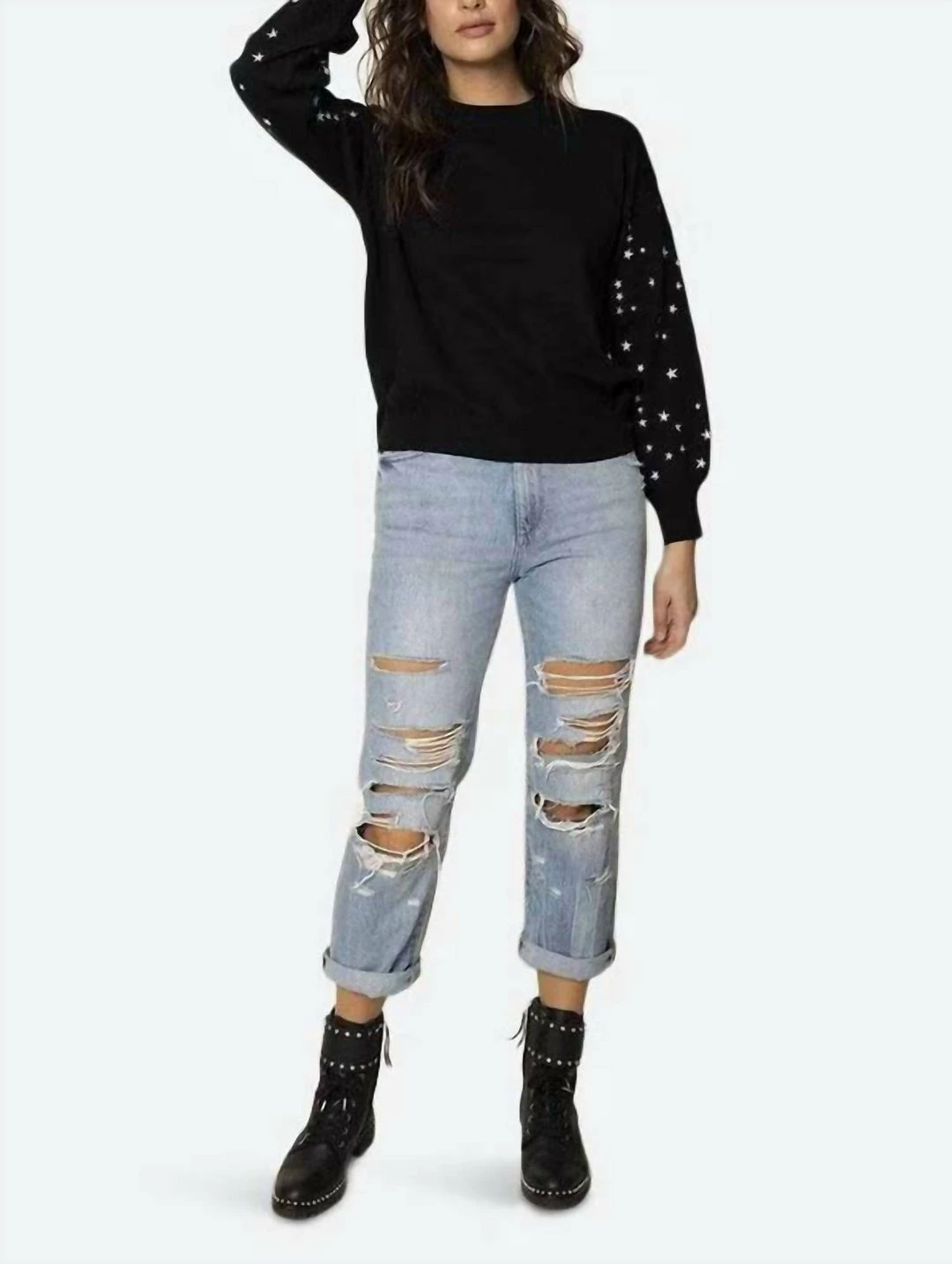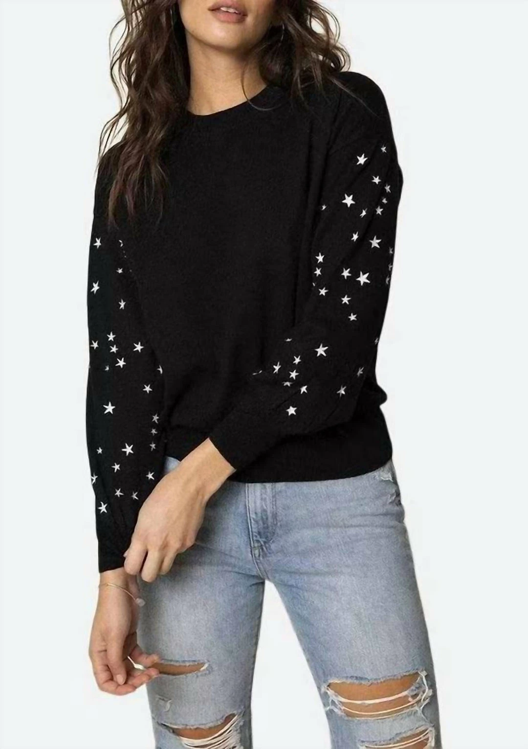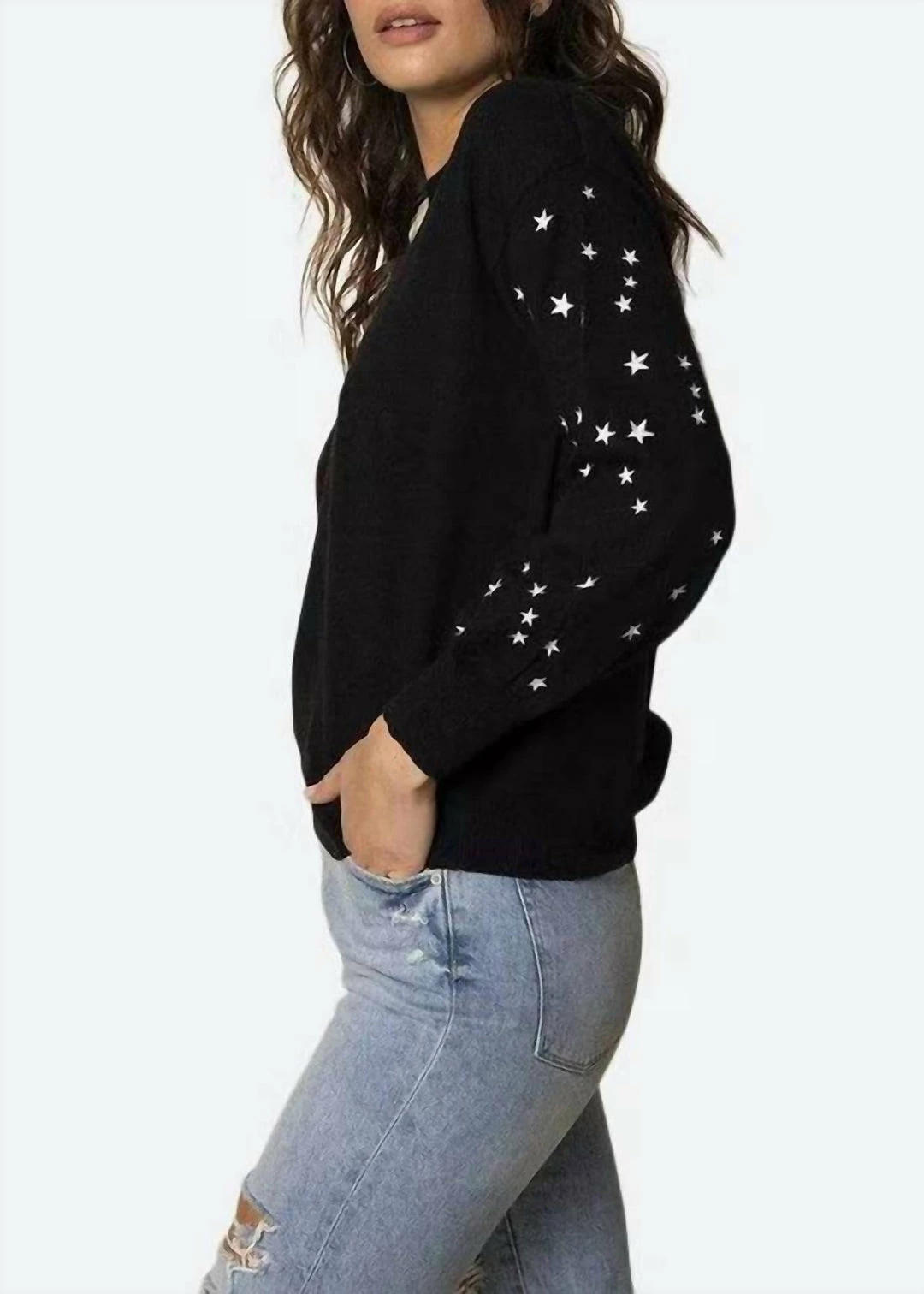 The Celeste Sweater has embroidered stars all over the sleeves and has a cozy straight fit. Pair with your favorite leather pants for an unforgettable night look.