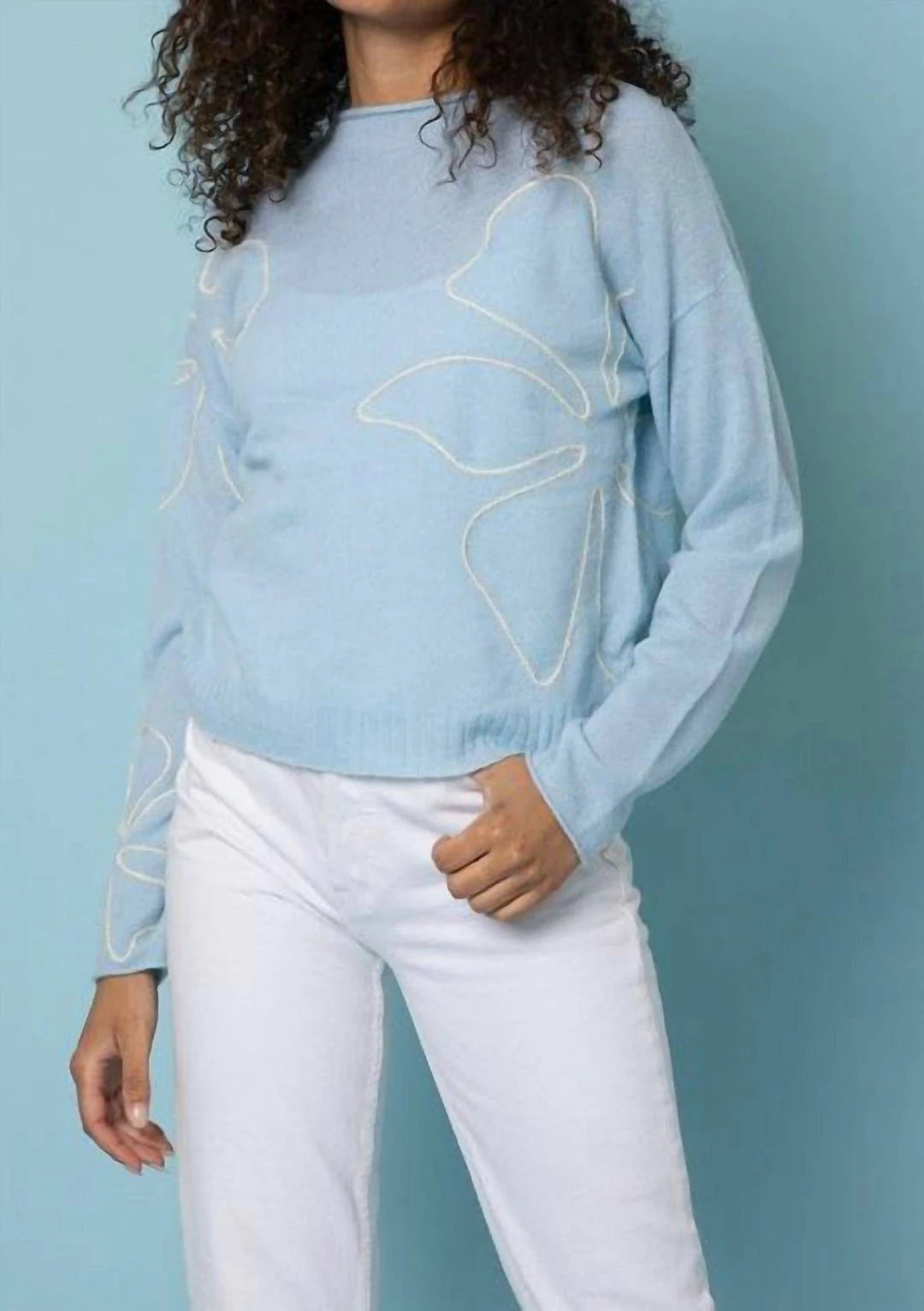 Light blue lightweight cashmere long sleeve sweater with Ivory stitched flower pattern