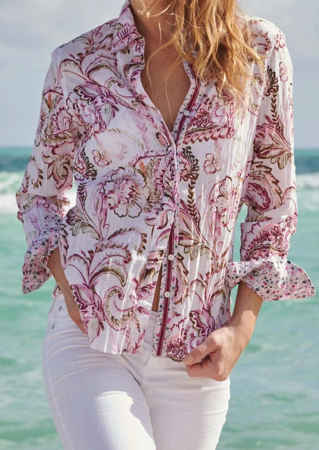 100% cotton print button down shirt. Crinkle voile fabric with roll-up sleeves and ribbon detail.