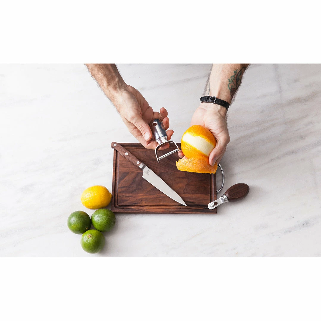 This zest-infusing set includes – Peeler the professionals tool for making garnishes. A Channel Knife the specialty blade for creating artful twists and unlocking flavorful oils. A Bar Knife the go-to knife for preparing citrus, fruits, herbs and spices. And of course, a Bar Board sturdy, rich black walnut, and the ideal size for your cocktail prep.