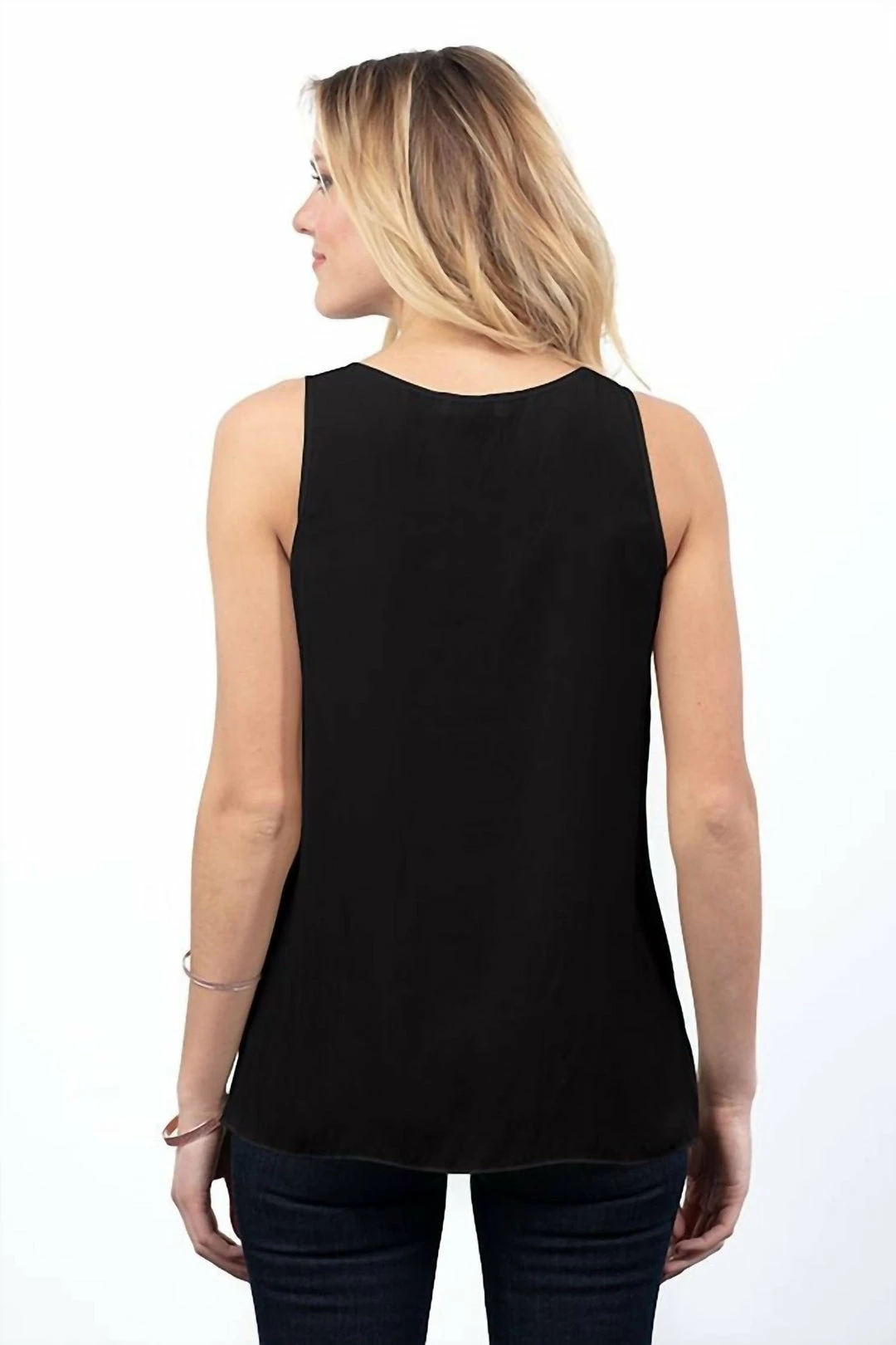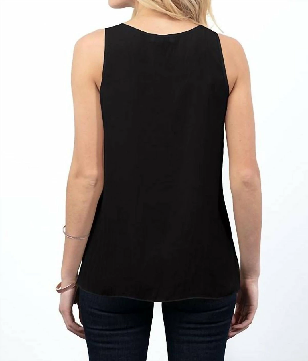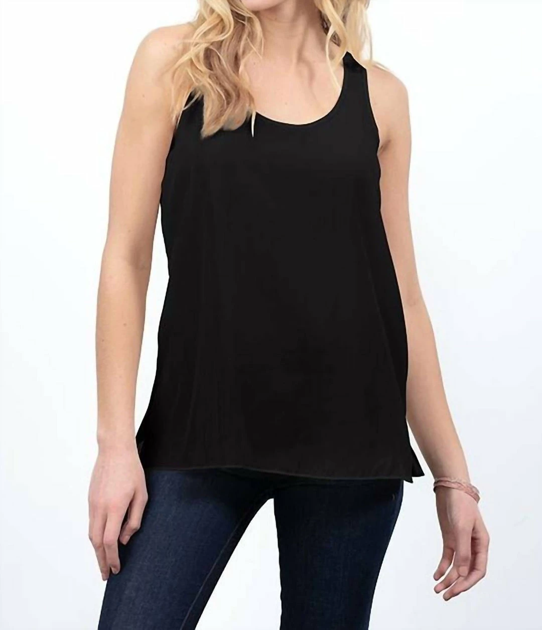 The distressed satin side-slit tank features a straight bottom, side slits, and full-width back. Great with shorter jackets or just on its own. Another perfect essential from Lola & Sophie.100% PolyesterMachine wash cold, delicate. Hang or lay flat to dry. Do not tumble dry.Made in the USA