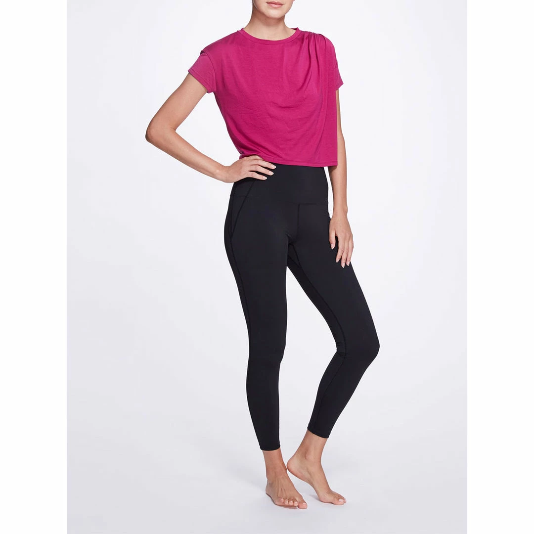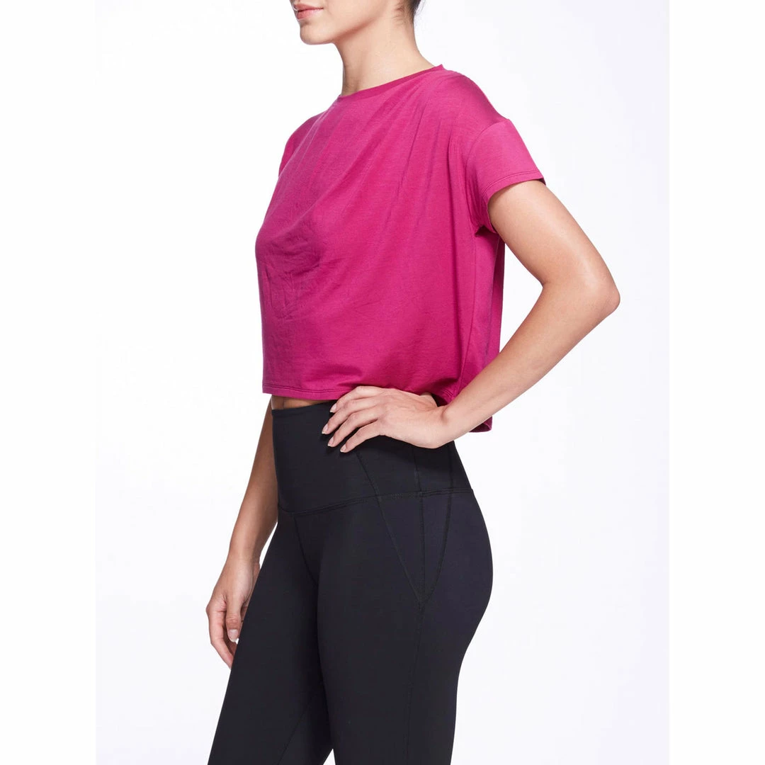 The Misty Top features super soft drapy weight jersey, crew neckline, drape detail on shoulder, relaxed cropped fit.