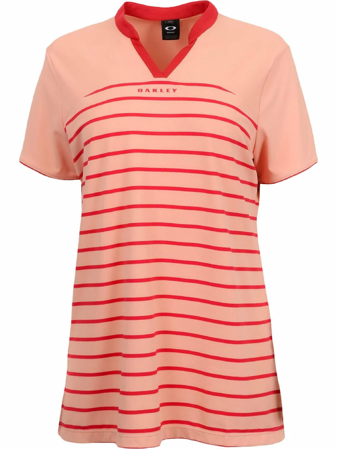 Work on your swing in the Bella short sleeve golf polo by Oakley. Made with 88% polyester and 12% elastane. This polo is crafted with a flattering semi-fitted design and a V-Neck construction. This sporty polo can be paired with all your favorite golf pants and shorts. Logo detail. Pull on. This polo is guaranteed authentic.