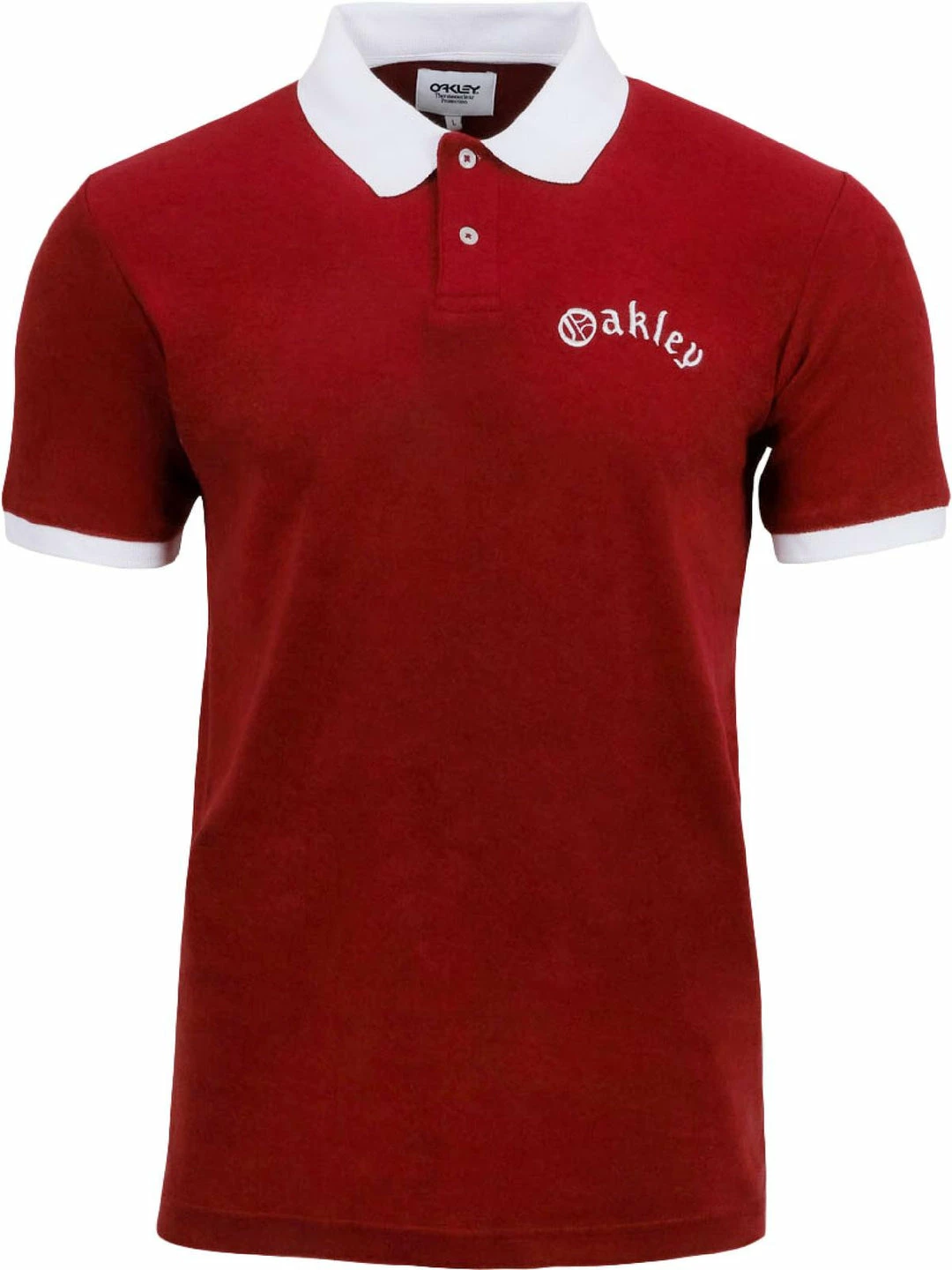 Hit the course in this terrycloth polo shirt by Oakley. Made with MATERIAL COMP. This polo’s ultra soft fabric offers a bit of warmth for brisk mornings on the green. It features an embroidered logo and contrast trim details. Pair it with your favorite golf pants to complete the look. Two button placket. Pull on. This polo is guaranteed authentic.