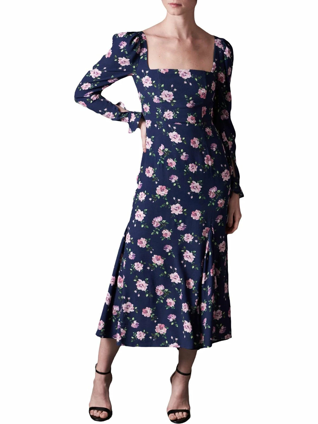 Feel effortlessly elegant with Marianne printed midi dress by Sau Lee. Crafted with 100% rayon. This ultra feminine dress features a retro-inspired rose print, slightly puffed sleeves, and a distinguished square neckline. The ruffled details and front slit complete this graceful look. It’s beautiful style and classy vibes will make it a closet essential. Back smocked panel. Concealed back zipper closure. This dress is guaranteed authentic.