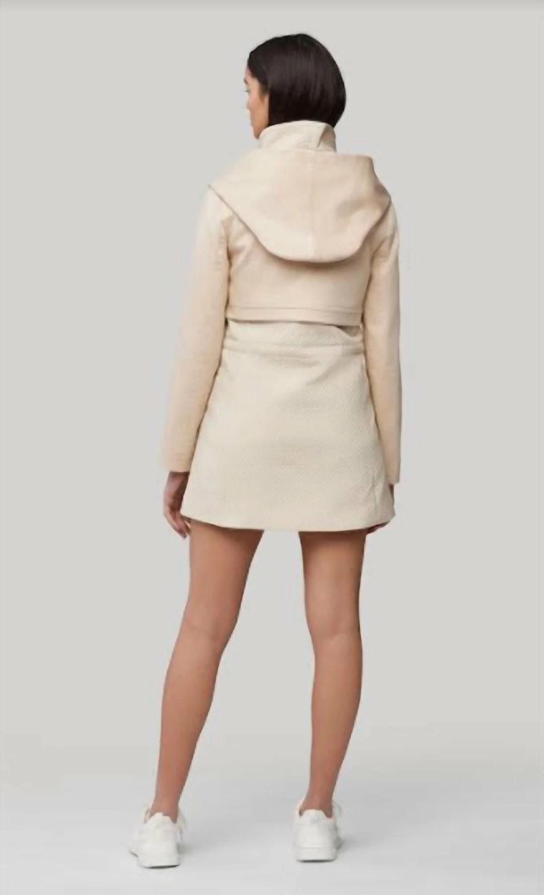 PRODUCT DETAILSSemi-fittedMid-thigh lengthStretch cotton combo fabric at front and back, storm flaps, hood, and sleevesDramatic hoodAdjustable elastic drawcords at waistYKK 1-way silver Metaluxe® zipper front closureAngled welt pockets with hidden zipperThermolite Core Extra® polyester fillWater-repellent