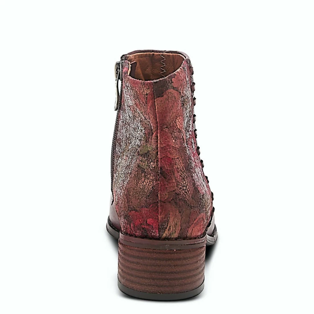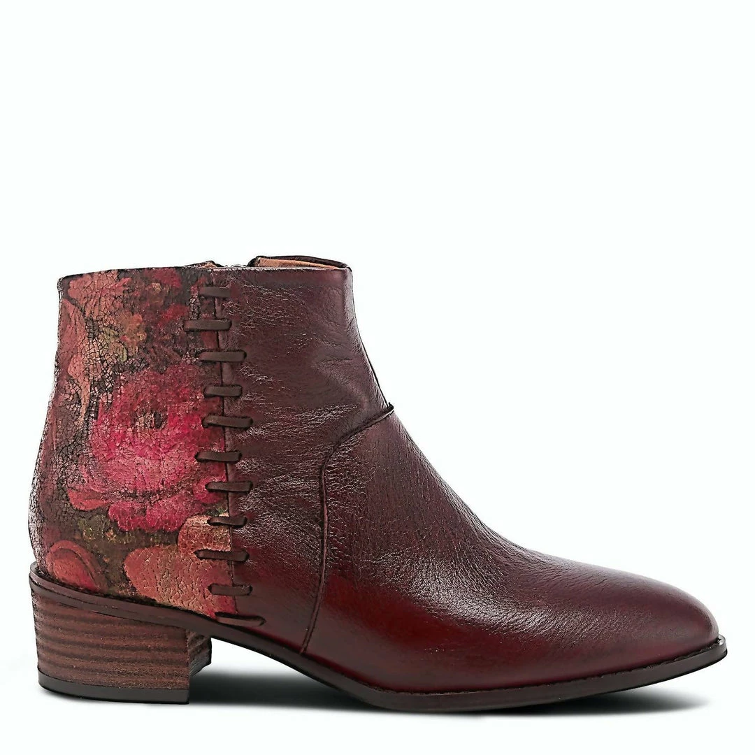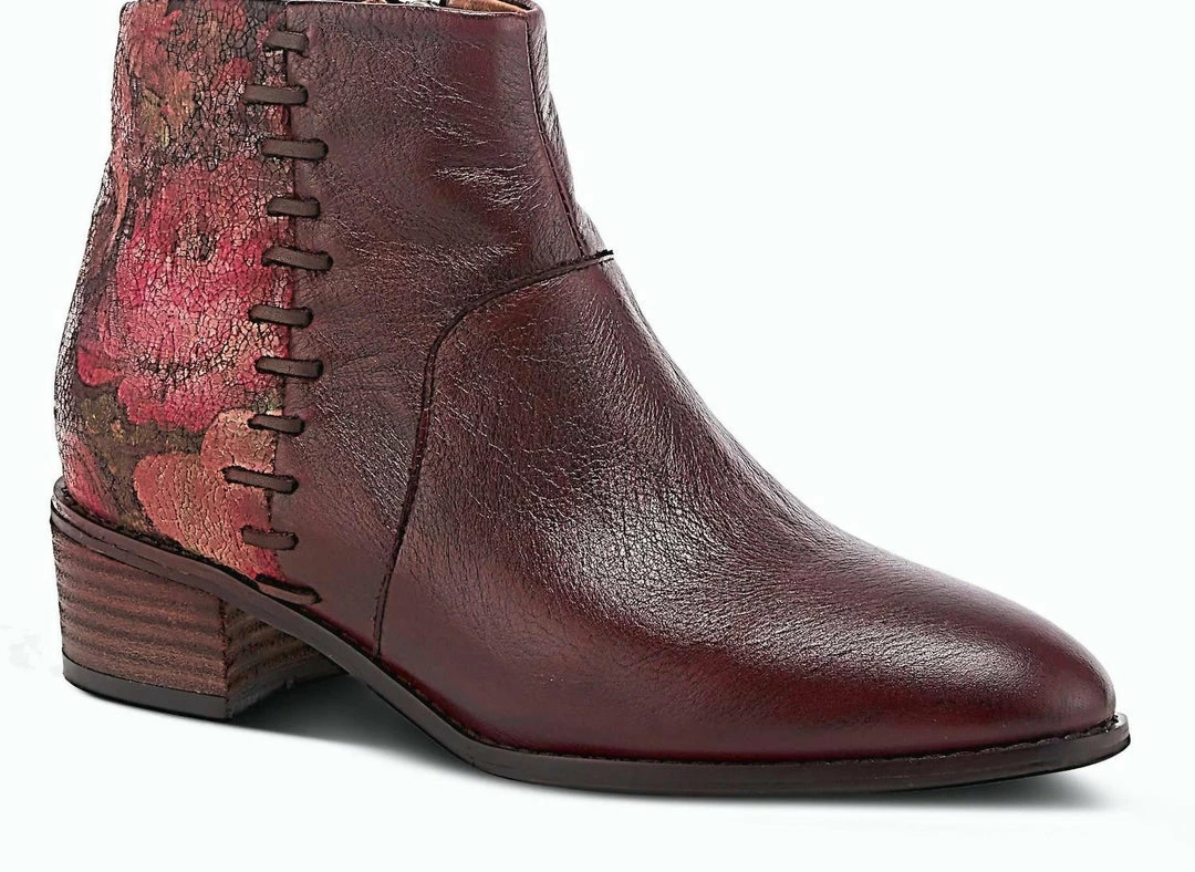 Classy leather combination bootie featuring a floral print wrapping the heel and ankle with oversize side stitching on a comfort outsole.Upper – Leather, TextileLining – SyntheticInsole – SyntheticOutsole – RubberClosure – ZipperHeel Height – 1 3/4″Platform Height – 1/4″Shaft Height – 4 1/4″Circumference – 9 1/2″Features – – Comfort, Hand-painted, Padded Insole, PremiumFitting��notes – Sizing runs small, recommend to order next size up.��