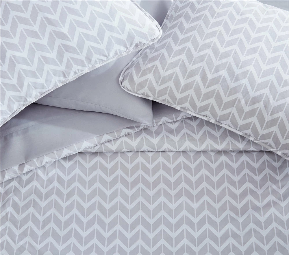 The Nesting Company Pine 7 Piece Bed in a bag Reversible Comforter Set updates any bedroom into fun and inviting space. This stylish comforter features a Gray and white chevron print broken up by white vertical stripes. Made from super soft Microfiber, perfect for year round use. Featuring 1 comforter, 2 shams, 1 flat sheet, 1 fitted sheet, 2 pillow cases, this set completes your bed with ease. This set uniquely has the same print on the front and back of the comforter. This set is machine washable for easy care.