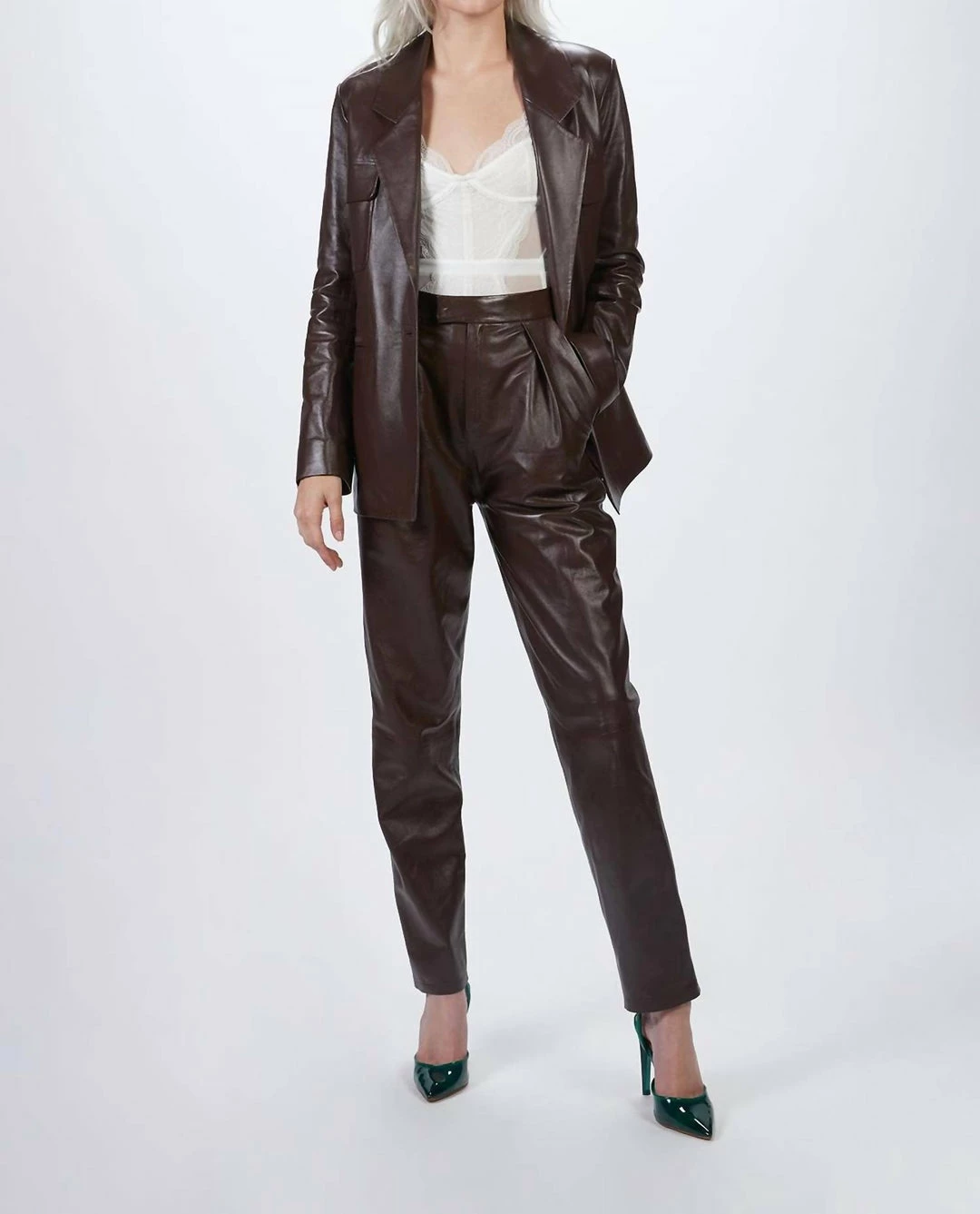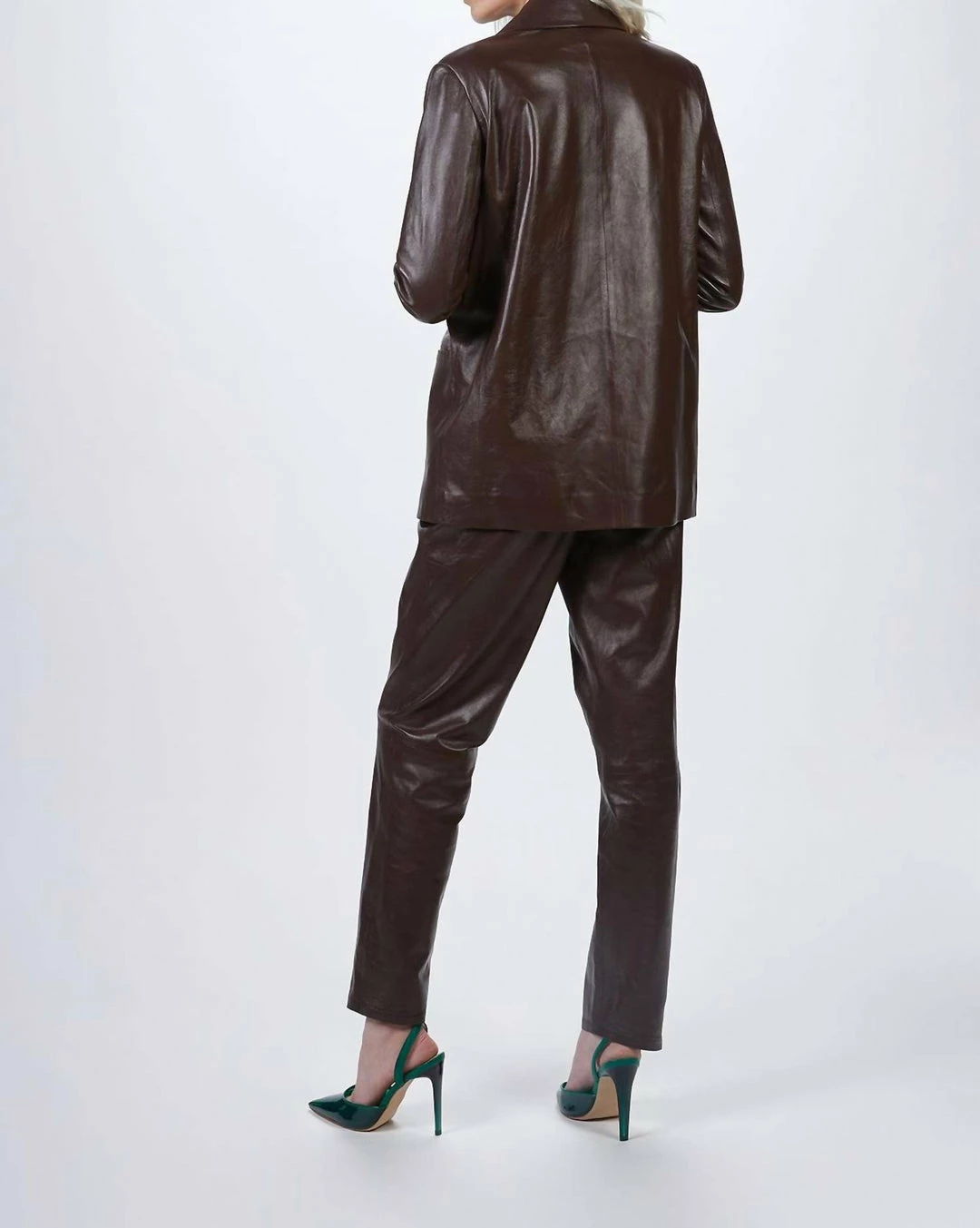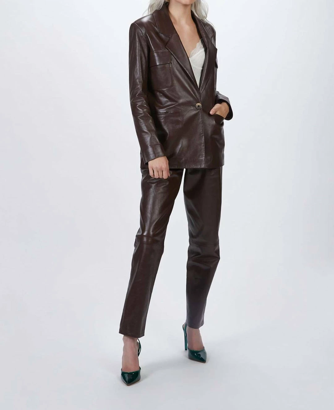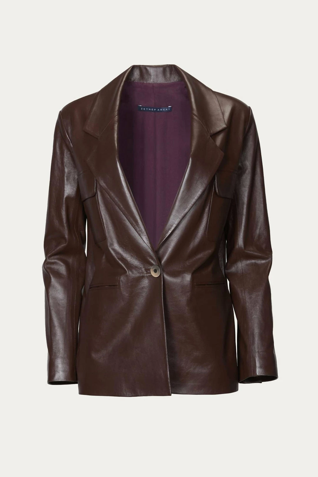 Made from buttery lamb leather with a high-shine finish in Turkey, this timeless piece will take you from day to night, year after year. It features notched lapels, two breast flap patch pockets and two front slit pockets. This single-breast style is fully lined in lustrous silk for the perfect drape. Pair with the label’s matching ‘Pleated Leather Pants’ to complete the look.This item is part of a matching setFabrication – 100% LambskinCare – Dry cleanUS Sizing Marissa is wearing size US 0